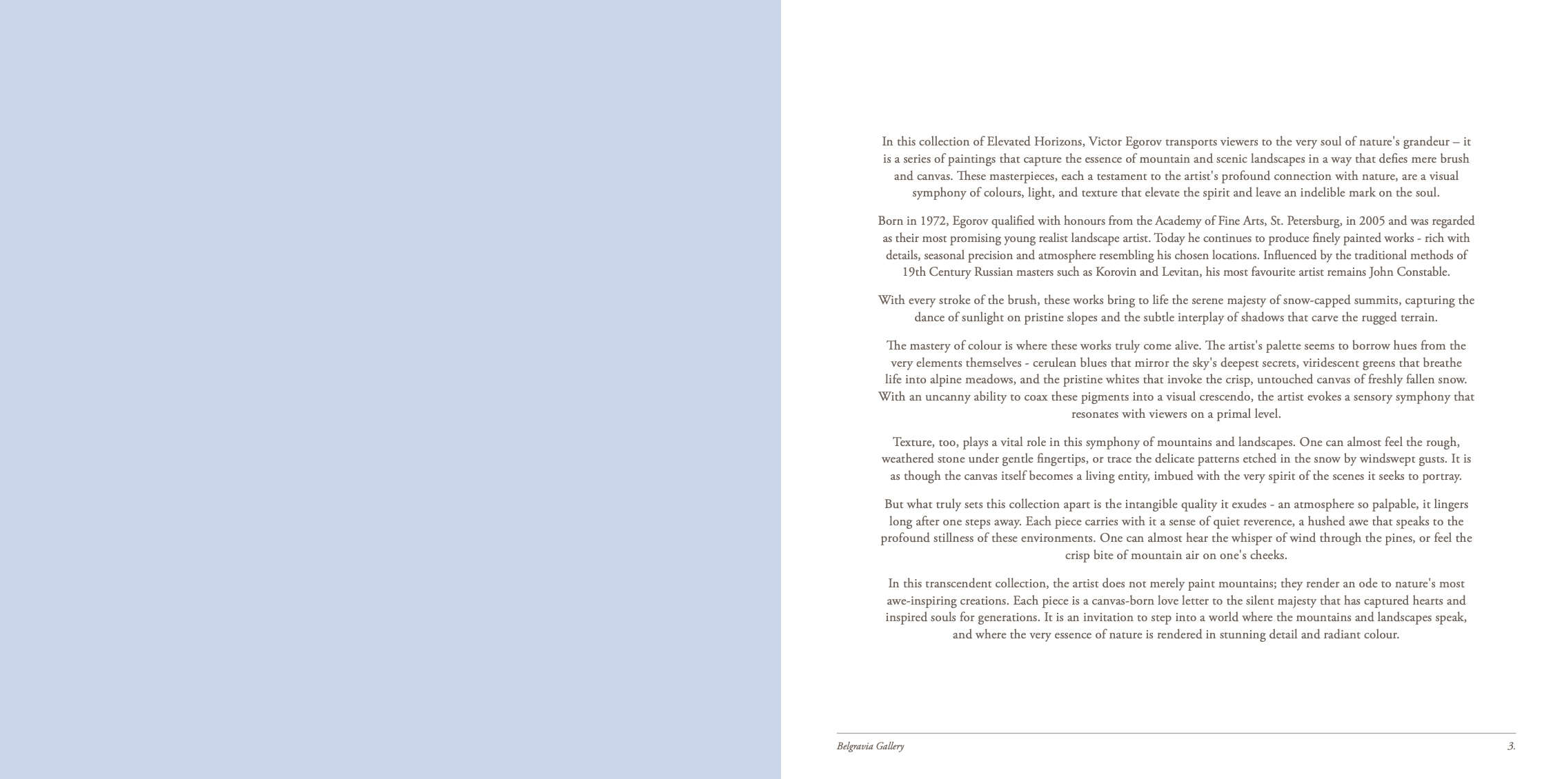 Born in 1972 in the Urals, Egorov qualified with honours from the Academy of Fine Arts, St. Petersburg in 2005 and was regarded as St. Petersburg’s most promising young realist landscape artist. Today he continues to produce finely painted works - rich with details, seasonal precision and atmosphere resembling his chosen locations. Influenced by the traditional methods of 19th Century Russian masters such as Korovin and Levitan, his most favourite artist remains John Constable. Captivated by his stunning paintings, Belgravia Gallery recently commissioned Egorov to paint Verbier, Switzerland.